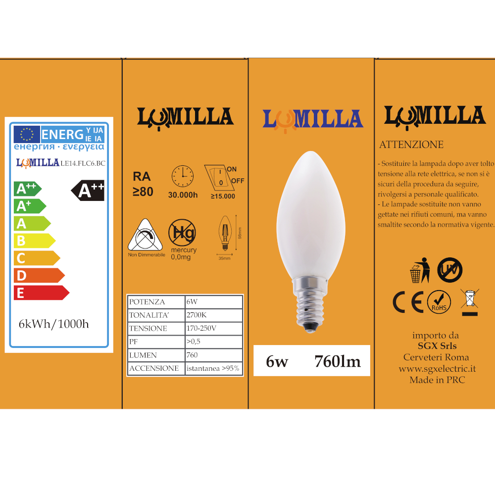 LUMILLA LAMPADINA LED FILAM. CAND. C35 6W 760LM E14 2700K BIAN