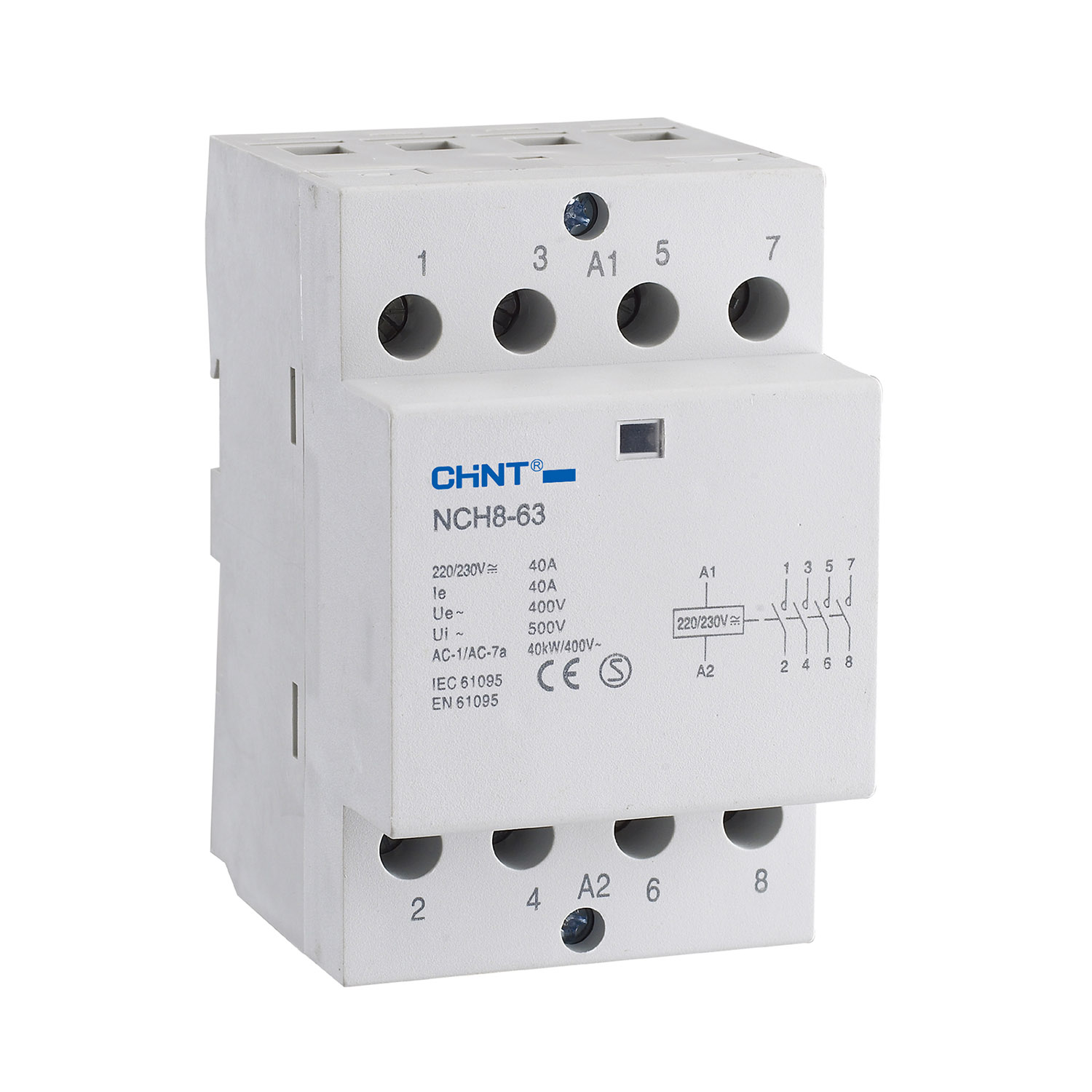 Contattori modulari serie NCH8 per utenze o complessi residenziali e industriali. Disponibili in versione bipolare e quadripolare, da 1 a 3 moduli DIN, con corrente nominale (In) da 20 a 63 A e tensione nominale 230 e 400 V. Contatti ausiliari 2NA, 4NA, 1NA+1NC, 2NA+2NC. Tensione bobina 230 V e 24 V. Versione bipolare da abbinare con distanziatori (in dotazione).