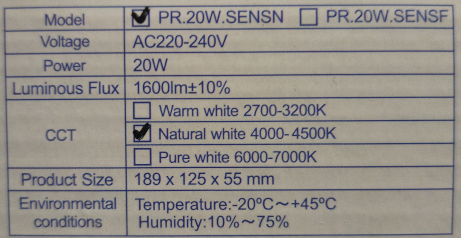sgxpr.20w.sensn proiettore faretto led 20w 4000k con sensore